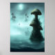 The fog is laying over the mushroom ocean. This is a AI generated art.