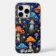This painting depicts a fantastical field filled with a diverse pattern of glowing mushrooms. The artwork is chraacterised by its heavy impasto texture, with thick, expressive brushstrokes that give the fungi a sculpted and tangible quality. The mushrooms are arranged in a dynamic pattern and feature caps in vibrant shades of orange, blue, and purple, each with white spots. The deep blue background is dotted with glowing yellow orbs and stylised foliage, creating a surreal and magical atmosphere.