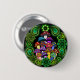 A button with colourful psychedelic mushrooms surrounded by green paisley and green mandalas.