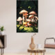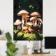 A cluster of various mushrooms, some with white caps and others with red, orange, or brown caps, are depicted in a lush forest setting. The mushrooms are arranged in a semi-circle, with their stems emerging from a bed of green moss and leaves. The background is a dark, shadowy forest, with sunlight filtering through the leaves and illuminating the mushrooms.