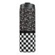 Music lover's thermal tumbler design has a '50s diner jukebox vibe with the top panel of jumbled white musical notes on black background and a black and white chequerboard pattern bottom half.