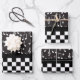 Fun wrapping paper sheet trio has a '50s diner jukebox vibe with the top panel of jumbled white musical notes on black background and a black and white chequerboard pattern bottom half.