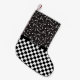 Fun stocking design has a '50s diner jukebox vibe with the top panel of jumbled white musical notes on black background and a black and white chequerboard pattern bottom half. Personalise with name or monogram.