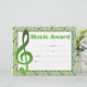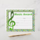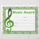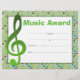 Music Award Certificate for music teachers and band directors. Make your student proud of their accomplishments with an attractive certificate! The "Music Award" text can be changed. The four lines state "presented to", "for" , "on this day the" blank "of" blank, and "signed".