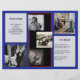 Tri-fold business brochure template with lots of photos. Blue, red, grey and black colours with customisation by block on both sides. Side one has a large block for name of business. Add a horizontal photo in this area. To the left on the same side, upload two photos and add some text over a dark red background. Side two has places for three photos in the centre and one on each side panel. Showcase band or team members, co-owners, or store pictures, etc. that has to do with the business. Also great for non-profit advertising. All text is printed in black or light grey, with business name in dark red. Fold into thirds after purchase. Change fonts and colours in the edit area if you wish. This design was made to fit the large 8.5 x 11 size paper.