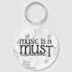 Make your love for music known with this musical keychain. Black and white design is complete with background sheet music notes. Text reads, "music is a must."