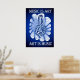 This unique musical design combines my love of art and music. It features a large intricately detailed and stylised musical treble clef with the words "Music is Art" and "Art is Music" on a brilliant blue vignette style background that fades to black at the outer edges. The treble clef itself was hand drawn in pen and ink in a design that includes many repeated pattern elements such as basketweave, lines, curves, scallops, dots, ropes, and swirls. Surrounding the treble clef is a burst of ruffled lines meant to represent the musical staff or stave and the sound waves of music that come from the centre. The design is carefully shaded for a dimensional 3D effect.