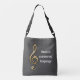 This beautiful crossbody bag features a gold and silver clef symbol along with the words "Music is a universal language". The same design is featured on both the front and back of this bag and is set against a dark grey background. The text can easily be customised to suit your needs. This tote bag makes a unique music teacher gift at the end of the school year or during the holidays.