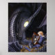 A young, red haired bard soothes a silver dragon, playing her harp by the light of his glowing eyes. They are sitting on the dragon's treasure hoard, which is filled with many things (jewelry, coins, crowns, the hood ornament of a 1937 Packard - normal stuff that dragons collect.) The dragon's talons, wing, and tail embrace his little music maker, and you can see the whole scene (including the artist) reflected in his shining scales. This was my first Dragon Magazine cover. The original was 17x22 inches.