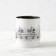 White mug with black handle, and a musicial theme.