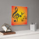 Colourful three dimensional music design with notes in black and gold on a bright orange and red gradient background. Trebles, flats, sharps, quarter, eighths and sixteenth notes on a curved staff portray a contemporary look for the modern musician.