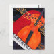 Music staff and notes float above a cello and piano in intense reds and golds. The keyboard stands out in contrast with the bold colours and dark background.