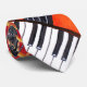 Music staff and notes float above a cello and piano in intense reds and golds. The keyboard stands out in contrast with the bold colours and dark background.