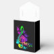 A fun, colourful party favour box for a music themed party or event with rainbow coloured treble clef music note in an abstract paint splatter effect that just pops on black. So easy to personalise with your name or message at no extra cost.