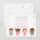An invitation with cute kids coming together to play various musical toy instruments! The musical toy instruments include drums, tambourine, trumpet and rattle! Perfect for that fun music themed birthday party celebration! This colourful invitation communicates a sense of fun and is perfect for both birthday boys and girls! Personalise easily with your party details. Reverse page is a pattern made using musical notes and symbols (like clefs, sharps, flats) and stars.