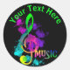A fun, colourful sticker for a music themed party or event with rainbow coloured music treble clef note in an abstract paint splatter effect that just pops on black. So easy to personalise with your choice of text at no extra cost.