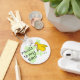 A bright yellow canary is whistling his little heart out, with music notes above him. To the left it reads, "Music to my Ears." Green leafy background. Unique canary keychain for bird lovers.