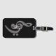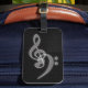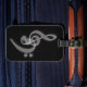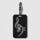 A classy simple black/white music themed luggage tag with business card slot- white treble and bass clefs against a textured black background. Music Love.