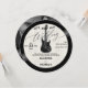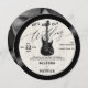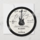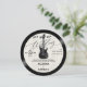 An elegant, music themed wedding invitation template in the shape of a vinyl record, that features a textured light ecru background with an electric guitar, glowing, and a partition overlay, with the title "Let's Rock Our Wedding". An elegant, fun choice for musicians or music lovers and want a more informal, but elegant, wedding celebration. Perfect for lovers of vintage records, vintage LP labels and 70's style script fonts. It includes a photo template on the back, as well as a QR code. An all in one wedding invitation with a unique shape.