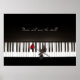 Art poster for music lovers with beautiful still life featuring a red rose on black and white grand piano keys and calligraphy text slogan: "Music will save the world". Image also available as wrapped canvas and other prints.