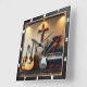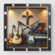 This square wall clock presents a captivating shadow box display of various musical instruments, including acoustic and electric guitars, a violin, and a keyboard. A prominent crucifix is centrally positioned, unifying the collection under a warm, spotlight-illuminated backdrop, celebrating the harmony of music and faith.