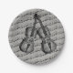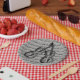 Paper plates with musical notes with violins against a grey backgrounddddddd