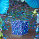 A cascade of musical notes in turquoise, violet, pale pink, aqua and white on a deep indigo blue background
