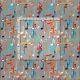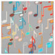 A cascade of musical notes in bright turquoise, orange, peach, pink and cream on a medium grey / grey background fabric