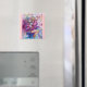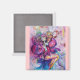 Colourful, whimsical,funny pink clown playing bugle with an expressive owl and joyful musical notes,flowers,leaves in vibrant red,fuchsia,violet,purple,blue,white colours, watercolor painting by Bulgan Lumini (c)