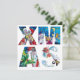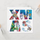 Colourful alphabet letters , whimsical artistic Christmas monogram design with original acrylic paintings ,Snowman ,and Penguin's serenade , Santa Claus playing violin in the snowy winter night ,yellow moon,stars,an owl ,floral ornaments,winter plants,Christmas tree, balloons, holly berries in bright red,green,white,blue,yellow colours.