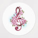 Pink treble clef with delicate, detailed pink Japanese cherry blossoms against white background painted over with light blue paint. Blooming pink sakura.