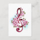 Pink treble clef with delicate, detailed pink Japanese cherry blossoms against white background painted over with light blue paint. Blooming pink sakura.