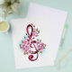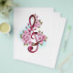 Pink treble clef with delicate, detailed pink Japanese cherry blossoms against white background painted over with light blue paint. Blooming pink sakura.