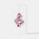 Pink treble clef with delicate, detailed pink Japanese cherry blossoms against white background painted over with light blue paint. Blooming pink sakura.