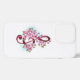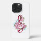 Pink treble clef with delicate, detailed pink Japanese cherry blossoms against white background painted over with light blue paint. Blooming pink sakura.