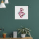 Pink treble clef with delicate, detailed pink Japanese cherry blossoms against white background painted over with light blue paint. Blooming pink sakura.