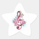 Pink treble clef with delicate, detailed pink Japanese cherry blossoms against white background painted over with light blue paint. Blooming pink sakura.