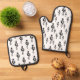 Cute oven mitt and pot holder set, with a simple treble clef pattern on a white background. A fun musical item to add a touch of classical music to your kitchen and cooking supplies.