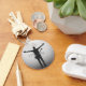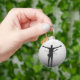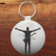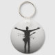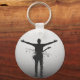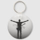 This circular aluminum keychain showcases a striking black-and-white musician silhouette with outstretched arms and a unique glitch-style effect.