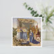 Baby Jesus lays on a blanket in front of a shed as Mary watches over him. In the background musicians play songs on their stringed instruments.