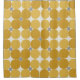 Bold graphic flower shapes in warm mustard yellow, soft grey, and off-white create a crisp, symmetrical layout. The design reflects Orla Kiely’s love of simplified botanical forms and balanced, optimistic colour palettes.