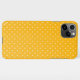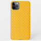 Pattern of white polka dots on a mustard yellow background. The dots are evenly spaced, creating a simple, vintage, playful aesthetic.