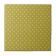 Pattern of white polka dots on a mustard yellow background. The dots are evenly spaced, creating a simple, vintage, playful aesthetic.
