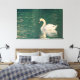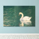 A serene image features a white mute swan gracefully gliding on a body of water. The swan's neck is curved in a classic S-shape, and its reflection is visible in the water. The water is a muted green colour, suggesting a natural setting. The background is blurred, indicating a shallow depth of field, which focuses attention on the swan. The overall mood is peaceful and tranquil.