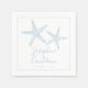 Soft blue starfish cocktail napkin with personalised bride and groom names and wedding date, perfect for a beach wedding or bridal shower celebrating the couple who love the ocean.