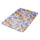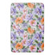 Muted watercolor style flower pattern of pink, orange, lavender flowers with green leaves on a mint background.