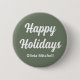 This elegant green - grey coloured button is the perfect way to add a touch of festive cheer to your holiday outfit. The text "Happy Holidays" is customisable and also the name can be personalised.