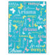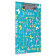 Cute little graphic outline butterflies personalised clipboard. This muted aqua, soft blue, pink, green, yellow and coral text typographical bag can also be customised with your own short name, currently reads Ariana. Other names and colours available or contact me for name requests. Original art and design by Sarah Trett for www.mylittleeden.com
