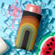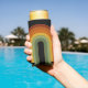 Retro rainbow design. Rainbow layers in muted colours, orange, red and green. Groovy retro rainbow gifts, home decor. Retro rainbow seventies Bottle cooler.