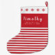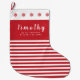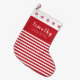 Celebrate your child`s 1st Christmas with a personalised holiday Christmas stocking that can be customised with his or her name plus the year. The white text is set in both a popular sans serif font plus a script font and includes the words `My 1st Christmas`. This design has a cranberry red and white stripe pattern plus cranberry red stars along the top.